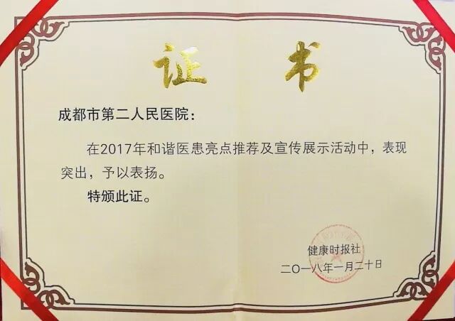 2018年1月20日,由国家卫生计生委医政医管局指导、人民日报社健康时报主办的“2017年和谐医患亮点推荐及宣传展示活动交流总结大会”在广州市隆重举行。会上对2017年和谐医患工作中表现突出的医院及个人进行了表彰。我院荣获“亮点创新”及“和谐医院”两项大奖,并做了题为“用人文关怀构建医患和谐”的现场报告。