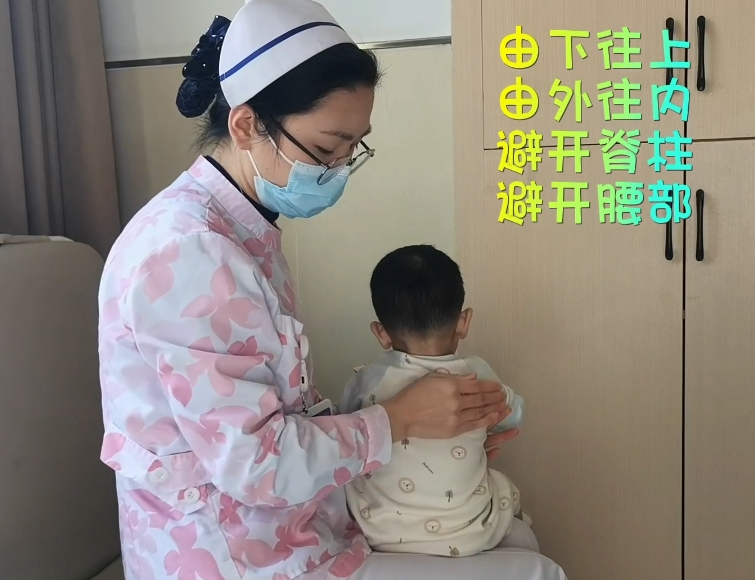 从下到上,从外向内,避开脊柱及肾区(腰部),迅速而有节奏地叩击,发出空而深的啪啪声,拍背的力度以患儿不感到疼痛为宜。痰液比较多的一侧肺部可以增加拍背时间。